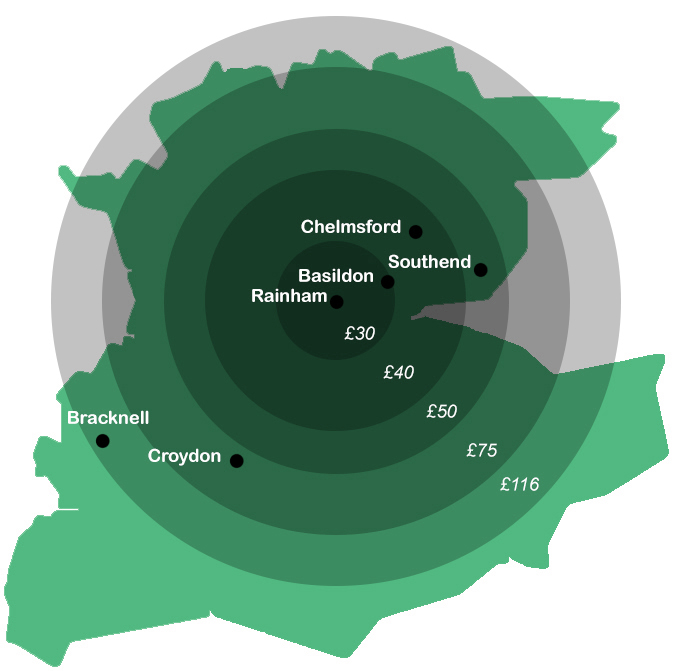 We base our deliver rates on distance from our HQ in Rainham. For example, Southend-On-Sea to the East being £50.00, Chelmsford to the North being £40.00 Bracknell to the West being £116.00 and Croydon to South being £75.00
